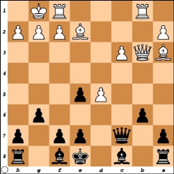 Misschien was het praktisch gezien het beste om nu (zie diagram links) maar zo snel mogelijk te rokeren (en een kruis te slaan), maar hier blunderde Zwart met 14. … e6??, en na 15. Lb5+ Ld7 ontstond de volgende, voor Zwart hopeloze stelling (zie diagram hieronder).