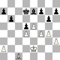 Mijn gedachten om na een geslaagde opening op winst te spelen werden door een grafzet ruw verstoord. Ik kwam met een blauw oog met de schrik vrij. Na wat theorie en hier en daar een onnauwkeurigheid heeft zwart een klein voordeeltje. Een remiseaanbod van mijn tegenstander wordt door mij beleefd geweigerd. De twee pionnen op de damevleugel zijn daar verantwoordelijk voor. De tegendreiging van wit op de koningsvleugel is nog ver te zoeken. Met bijvoorbeeld b5 en/of koning e6 verstevigd zwart zijn positie.