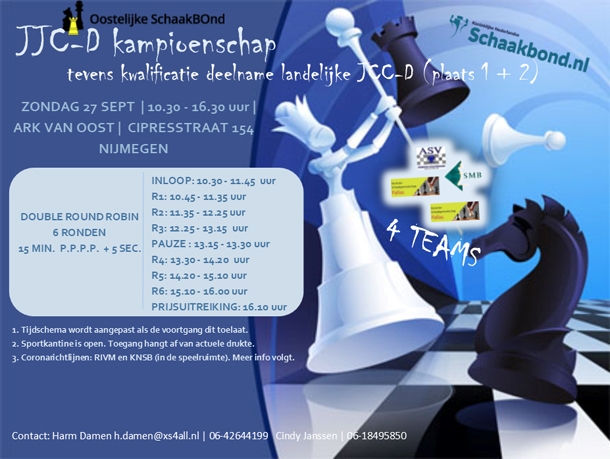 Onder auspiciƫn van de Oostelijke Schaakbond verzorgt SMB op zondag 27 september de strijd om het OSBO-Kampioenschap Jeugdclubteams D. Op het toernooi zijn er ook twee tickets te verdienen voor de halve finale van de KNSB Jeugdclubcompetitie D-teams op 7 november 2020. Aan de wedstrijd doen 4 jeugdteams mee. Pallas komt naar Nijmegen met 2 teams. ASV en SMB zijn ieder met 1 team vertegenwoordigd.
