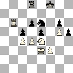 Daarna krabbelde ik op in de partij. Dankzij een sterk paard, maar vooral doordat ik een pionnenopstoot op de damevleugel deed. Ik kreeg zowaar enig tegenspel. Bovendien begon mijn tegenstander in tijdnood te geraken (nog iets van 5 minuten op de klok en ik 20 minuten). Bij de 45e zet bood hij zelf remise aan dat ik graag accepteerde. Ik geef hier de slotstelling. Met mijn toren en paard bind ik zijn stukken en zijn vrijpion kan in zijn eentje niet zomaar doorlopen. Mijn remise voelde als een overwinning.