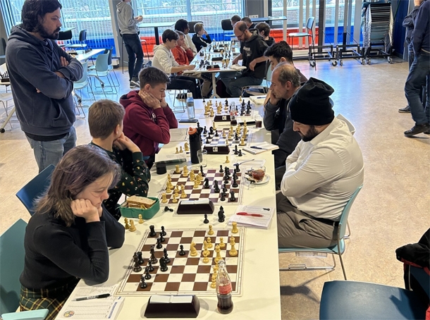 Het begon niet zo goed zelfs. Max was als eerste klaar. In een Franse partij - met wit - kwam hij al snel in het nauw, verloor een pion, bleef onder druk, verloor nog een tweede pion. Toen er vervolgens nog een toren verloren werd, gaf ie op: 0-1. Maar hij had ook goed nieuws: met zijn voetbalteam was hij deze ochtend nog kampioen geworden: Proficiat!