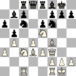 Mijn partij begon rustig. Ik hield mezelf steevast aan de basisregel van het schaken: snel rokeren en stukken ontwikkelen. Geert besloot in zijn tijd om met zijn b2 paard op reis te gaan, bestemming onbekend. Het gevolg voor hem was dat zijn positie ietsjes onderontwikkeld raakte. Vanaf zet 15 besloot hij dat het tijd was voor een agressieve wending in zijn partij met 15... g5?, terwijl zijn stukken grotendeels nog in de startblokken stonden (zie diagram).