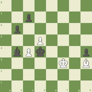En dan Peter. Ik had naast mij het eindspel met ongelijke lopers zich lang zien ontwikkelen, en had de stelling eigenlijk allang afgeschreven als pot- en potremise. Maar Peter bleef drukken, won zelfs een pion - vraag me niet hoe - en wist zijn tegenstander in serieuze problemen te brengen. In deze stelling (zie diagram) maakte wit de beslissende fout. De pion op c4 staat aangevallen en moet gedekt worden met Lf1, maar wit besloot dit te doen via Le6 (natuurlijk hopende op Kxc4 d6+!). Maar na Peters antwoord Ld6! gaat d6 niet meer, gaat c4 verloren en zo ook de partij.