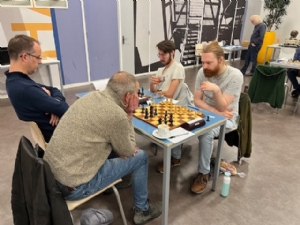 De laagste borden waren als eerste klaar. Van Guus' partij heb ik weinig meegekregen, dus ik ga er maar van uit dat dat een weinig enerverende remise was. Teun heeft over zijn Konings-Indier het volgende te zeggen: "Ik had de hele tijd een ongeveer gelijke maar iets passievere stelling, maar toen had hij een trucje waardoor hij een pion won, een grote aanval kreeg en uiteindelijk me mat zette." Een vroege achterstand die gauw teniet werd gedaan door Jet. Wat er voor mij uitzag als een theoretische discussie in een Sveshnikov leek lang gelijk op te gaan, maar hoe meer stukken er van het bord verdwenen, hoe ingewikkelder de zwarte zwakke pionnen te houden werden. In een toreneidspel viel er een, en toen nog een, waarna Zwart de handdoek in de ring gooide. 1.5-1.5 dus.