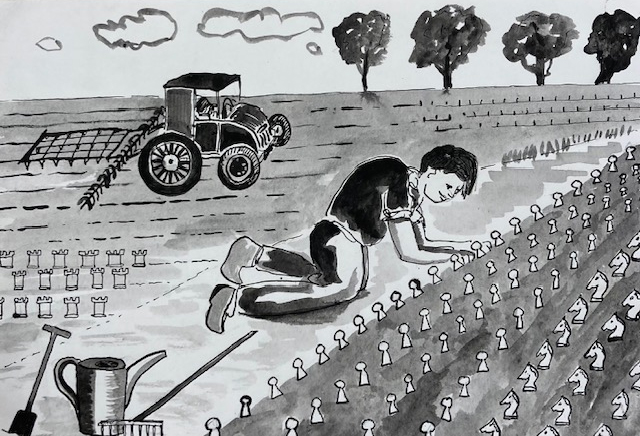 De teelt van planten, bloemen en fruit laat zien dat de landbouwtechnologie heel veel kan. De techneuten van bijvoorbeeld de landbouwuniversiteit Wageningen manipuleren allerlei soorten en rassen door DNA ingrepen en gen-technologie. Meestal is de doelstelling gericht op verhoging van productiviteit en het opbouwen van resistentie tegen ziektes. Oké, maar toch jammer dat het verhogen van esthetica en het bereiken van een fraaie vormentaal van plant of bloem nooit voorop staat. Dat moet maar eens veranderen. Mijn idee: ontwikkel en kweek planten en bloemen die qua vorm zijn gebaseerd op de verschillende schaakstukken. Moet kunnen, de know-how is er. Deze beeldtaal prikkelt de fantasie en geeft extra schoonheid in het landschap.