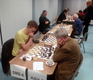 Geen René dus, waardoor de bordindeling wat moest worden aangepast. Door het leeglaten van bord 2, schoof Rolf terug naar bord 4, waar hij een goede partij speelde. Zijn tegenstander had niet alleen moeite met stil ademhalen, maar ook met de opening van Rolf, en verloor al snel twee pionnen in een ruil. Rolf speelde dit vervolgens prima uit, en won zo zijn tweede externe partij op rij. Terwijl onze jassen en broeken langzaam droogden, leek een overwinning deze avond niet onmogelijk. Yannick leek na een mooie aanval op weg naar de overwinning, maar het denkwerk hierbij had helaas teveel tijd geëist, en zo kreeg zijn zeer passief spelende tegenstander de overwinning in de schoot geworpen. Jan wist op bord 7 vervolgens zijn tijdsvoordeel niet uit te buiten, en verloor zelfs in een remiseachtig eindspel. Roel en Oscar stonden toen al een tijd tegen materiaalachterstand aan te kijken, en zo was de stand opeens 5-1 voor ASV. Guus wist in navolging van Rolf ook zijn tweede partij winnend af te sluiten, al had hij het drie zetten eerder niet meer zien zitten: terwijl Guus zijn hand al uitstak voor remise, herinnerde ik hem er subtiel aan dat hij dit eerst even met zijn teamleider moest overleggen. Omdat Guus ook nog geen zet had gedaan, was de remise snel vergeten en kon hij een mooie overwinning bijschrijven. Ik had er vervolgens 5-3 van kunnen en moeten maken, maar in tijdnood mistte ik de winnende zet. Niets is meer frustrerend dan die winnende zet vervolgens alsnog zien, een zet te laat, en vol woede weigerde ik zijn remiseaanbod: ik moest en zou deze partij winnen! Uiteindelijk kon ik niets anders doen dan hem te vlaggen, maar zonder winstmateriaal zat er niets anders in dan remise: 5½ - 2½. Speelde SMB 5 nog prima tegen een ASV 8 vol Afghanen, vanavond leek het voor SMB 4 meer op afgaan.
