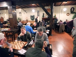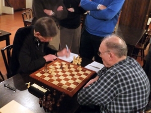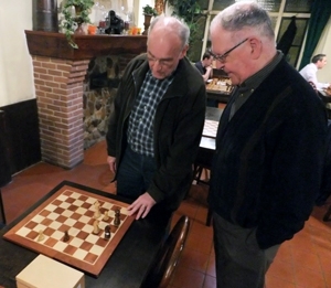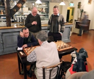 Ik ging even mijn benen strekken en liep snel langs de diverse borden. Ik zag dat Willem Dentz bezig was met een prachtige dynamische koningsaanval met toren en dame. Zag er geweldig uit. Willem overspeelde zijn tegenstander. Hans Eshuis, die ik in de speelzaal terloops sprak en die een scherp oog heeft voor partijstellingen, zei dat Willem dit glansrijk en absoluut ging winnen. Het tweede punt is binnen. Dacht ik.