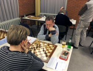 Na een welkomstwoord werden de klokken ingedrukt en al snel ontstond er tekening in het geheel. Evert Niessen wist in het begin van zijn partij een loper van zijn tegenstander klem te zetten en te winnen. Met een vol stuk voor, zeker aan het begin van de partij, is het lekker spelen. Hij moest er wel nog een lange partij voor uitspelen, maar uiteindelijk kon hij alle zware stukken afruilen en zijn materiaalvoordeel van een loper was in het pionneneindspel beslissend.