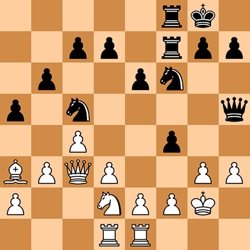 Tot dusver het verloop en zie nu het diagram voor de partij, waar Lars de zwarte stukken beheert. Er zijn al redelijk wat zetten gedaan, maar er is nog geen pion geslagen. De zwarte stukken staan iets agressiever maar als wit nu ervoor kiest om aan de grote schoonmaak te beginnen, kan hij een marginaal voordeeltje houden. Zie bijvoorbeeld 1.d4 Pce4 2.Pxe4 Pxe4 3.Df3 Dg6 4.Dg4 en zwart moet nu dames ruilen of ruil toelaten, waarna f3 niet meer te voorkomen is en zijn f-lijn geneutraliseerd wordt. Hierna staat wit iets beter omdat de dreiging weg is en zwart zijn paard niet in het centrum kan handhaven. In plaats van d4 speelde wit hier echter 1.Pf1?? In eerste instantie lijkt dit een verdediger te mobiliseren die bruikbaar is vanwege de dreiging fxg3, maar niets is minder waar! Een eenvoudige telling leert dat g3 slechts eenmaal staat aangevallen en al tweemaal verdedigd, bovendien kan op korte termijn alleen de zwarte dame nog extra druk uitoefenen op g3, waarna dit veld nog steeds voldoende verdedigd wordt.