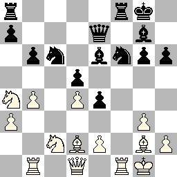 Zelf speelde ik tegen Ron Berendsen met zwart (zie diagram). Ik sta een beetje gedrongen. 9… De7 is voor de hand liggend, dit leek mij echt echter geen prettige zet omdat ik in de penning zou blijven staan. Ik speelde echter 9… Db6 10.exf6 Dxb2 In deze stelling is 11.Kd2 winnend voor wit. Wit speelde echter iets anders: 11.De4 Kf8 12.fxg7 Kxg7 en wit heeft geen schaakjes meer, hij moet nu een stuk geven. 13… Lh6 Kxh6 14.Dh4 Kg7 15.Dg5 Kf8 16.Dd8 en eeuwig schaak.