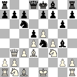 Zelf verloor ik met zwart vrij kansloos aan bord 2 tegen Michel Auwens. Soms heb je je avond niet. De partij leverde niettemin een leerzaam moment op. Wit heeft zojuist 8.Db3 gespeeld. Ik speelde hier, veel te passief, 8... Tb8?, een zet die me een pion zou kosten. Geboden was hier 8... Pa5, om de dame van de diagonaal g8/a2 af te krijgen. Na bijvoorbeeld 9.Da4 heeft zwart 9... c6 en het paard is gedekt. Die pion ging als volgt via een tamelijk eenvoudige combinatie verloren: 8... Tb8? 9.Lxe4 dxe4 10.Pg5 e6 11.Pxe4.