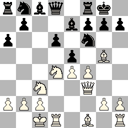 Zwart speelde 9... e5? met het plan Lg4 10.fxe5 Lg4 10... dxe5 11.Pf5 is goed voor wit 11.exf6 Lxf3 12.fxe7 Db6 13.exf8D Kxf8 14.Pxf3 Wit heeft 3 stukken en een toren tegen de dame en staat zeer goed.
