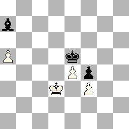 7. Valentijn: "Zo op het eerste gezicht moet zwart dit makkelijk kunnen winnen. Echter de zwarte koning kan niet naar f3 lopen omdat de e-pion van wit dan doorloopt. De loper moet naar c5 om e7 te voorkomen. De mop is dat zwart wint als de koning zo stom is naar a6 te lopen. De zwarte koning loopt dan naar c6, sluit de koning in en raapt alle pionnen op. De loper blijft echter op de a7-g1 diagonaal en dat verliest snel. Gelukkig is wit aan zet en zag hij dit niet."