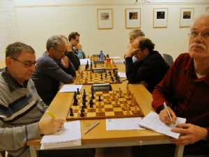 Aan bord 1 bij Michel Droste zag ik een sterke partij op het bord komen, met name van de tegenstander Eric Moeri. De verdediging van Michel was niet meer vol te houden, hij verloor helaas. Dorus Peelen speelde aan bord 5 tegen de ons bekende Jaap Stork. Het was een open spel met de Koning opgespeeld. Dorus moest goed opletten maar vanavond was zijn avond. Dorus ging materiaal winnen en zijn tegenstander zag in dat hij verloor.