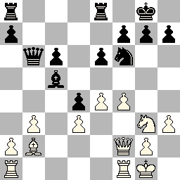 Redelijk snel daarna volgde ik met het tweede punt. Tegenstander Erwin Velders pakte met Zwart de opening niet geweldig aan zodat ik een voordeel kon pakken. Er lijkt weinig aan de hand, maar in feite is het voor Zwart al vrij lastig een constructief plan te verzinnen, terwijl Wit rustig zijn stelling kan versterken en kan gaan aanvallen op de koningsvleugel. Zwarts laatste zet is een indicatie dat hij ...e5 wil spelen. Of dat positioneel gezien wenselijk is is al de vraag, maar na mijn reactie 17.Tac1 heeft het ook nog een tactisch bezwaar. Mijn tegenstander had echter niet door wat voor gemene truc ik had ingebouwd en speelde nietsvermoedend 17...e5? 18.fxe5 Txe5 19.Txc5!? (19.Pf5 was overigens ook erg sterk) 19...Dxc5 20.Lxd4 Dd6 21.Lxe5 Dxe5 en ik had een belangrijke pion buitgemaakt. Gezien mijn dominante stelling kostte het me weinig moeite om vervolgens het volle punt binnen te halen: 2-0!