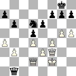 Wit heeft al zijn pionnen naar voren gestuurd maar heeft nog geen contact gemaakt met de vijandige linies. Zwart heeft zich gerealiseerd dat het tijd is om tegenspel te creëren. In de analyse thuis bleek dat ik door mijn passieve spel al een kans gemist had om de g-pion te winnen. Gelukkig kwam de herkansing op dit moment. Wit speelt 35. Db4 om b3 te dekken en zelf ook te dreigen, maar na 35... Dc2+ 36.Pd2? (Kg1 lijkt ook niet vrolijk) Pe4+ 37.Ke2 Pc3+! zijn wits problemen groter dan alleen de pion op b3. Wit geeft op, zelfs in het eindspel zijn er nog tactische trucs.