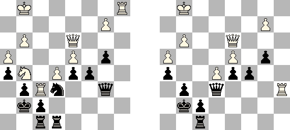 Kunt u de winnende zet voor wit en de winnende zet voor zwart vinden waarvan ik hierboven gewag maak? 1. Wat is de winnende zet van wit (zie bovenste diagram links)? 2. Wat is de winnende zet van zwart (zie bovenste diagram rechts)? Antwoorden onder aan het verslag.
