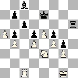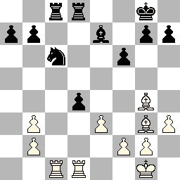 Bord 8 (Valentijn Phijffer, zwart) "Donderdagavond moest ik tegen mijn oud-leraar Nederlands, Hans van de Ende. Toevallig liep er ook nog een andere leraar van het NSG rond, Geurt Gijssen, leraar wiskunde. Hans en ik kennen elkaar dus al heel lang; ik kan me ook herinneren dat ik bijles van hem heb gehad. Vandaag kreeg ik weer bijles van hem. Ik koos voor het loperpaar maar een dubbelpion (zie diagram links). Hij koos voor loper, paard zonder dubbelpion. Het eindspel was glad gewonnen voor hem. De dubbelpion heeft mij opgebroken."