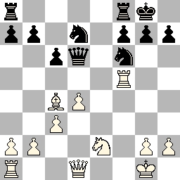 Bord 1 (Hans van Leeuwen, wit) (zie diagram links) Zwart speelde nu 20... d4?, wat wit alleen maar helpt bij het activeren van diens stukken. Er volgde 21.cxd4 Lxb3? (ik vermoedde al dat wit compensatie zou krijgen als zwart dit zou spelen, maar had nog niet door dat dit zo'n beetje gelijk verliest: zwarts gehele stelling bleek op deze loper te steunen) 22. axb3 exd4?