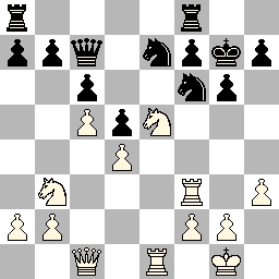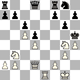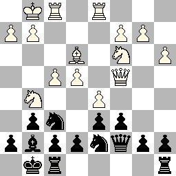 We beginnen met de partij van ondergetekende (met zwart aan bord 2), waarbij zwart na zet 15 van wit (15.Dc4) een belangrijke kans miste om de stelling te vereenvoudigen (zie diagram links). Aan deze zet kon ik merken dat Wit niet echt een plan had. Zwart staat wat gedrukt maar diens stelling is solide. Zwart had nu 15... Pg4 kunnen spelen, waarna Wit zijn zwartveldige loper niet van de g1-a7 diagonaal mag halen op straffe van kwaliteitverlies (bijv. 15... Pg4 16.Lc1? Db6+ 17.Kh1 Pf2+ etc.). Een mogelijke variant was: 15... Pg4 16.Ld4 Lxd4+ 17.Dxd4 Db6 18.Dxb6 Pxb6, waarna zwart niet meer zo gedrukt staat. Juist door dit ruimtegebrek liet ik enkele zetten later dom mijn paard insluiten, waarna de partij feitelijk voorbij was.