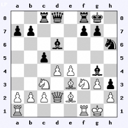 Op bord 1 speelde Alexander Greefhorst met wit tegen Max Timmers en kreeg na 9 zetten ook een paard cadeau. Max was zo geconcentreerd op zijn doorlopende h-pion dat hij niet in de gaten had dat de centrumpion die zijn paard dekte geslagen werd. Eenmaal op h3 liep de pion zich vast, en bleef eenzaam achter omdat de andere stuken de witte veste niet konden bereiken. Ondertussen probeerde Alexander zijn loper te ruilen tegen een paard op h6 (zie diagram links), in de hoop de zwarte veste open te breken. Max zag de bui al hangen, en in plaats van de loper terug te slaan, gaf hij zijn paard in de hoop de diagonaal c1-h6 beter te dekken met 16. … f6. Met twee stukken voorsprong kon Alexander beginnen met stukken afruilen, totdat hij alleen nog een toren en een paar pionnen over hield. Het tweede bordpunt was dus binnen.