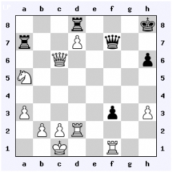 De langste partij werd gespeeld op bord 3 tussen Boaz Moerman (wit) en Teun Gal. Beide jeugdspelers speelden een zeer gelijk opgaande partij, waarbij zodra het even iets gecompliceerder werd (bijvoorbeeld bij een penning), het gevaar zo snel mogelijk werd afgeruild. Pas na 28 zetten ging het mis, Teun dacht een koningsaanval op te kunnen bouwen, maar de Arnhemmer vergat dat na een schaak en een tempozetje van Boaz zijn zet stukverlies zou betekenen. Welk stuk? Een paard dus. In de andere twee partijen bleek een paard verliezen gelijk te staan aan de partij verliezen, en binnen een paar zetten kreeg Boaz dan ook de kans om het af te maken met een Mat-in-tien (zie diagram). Deze werd helaas niet gezien (38. Pb7), de Mat-in-vijf die daarop volgde (38. … Da2) helaas ook niet, en ook de drie keer dat wit Mat-in-drie kon geven werden helaas gemist. Het eindspel werd spannend (beide spelers een tweede dame), spannender (wie behoudt het tempo?) en spannendst (kan Boaz ontsnappen aan eeuwig schaak), maar Boaz bleef opletten en wist de overwinning binnen te slepen.