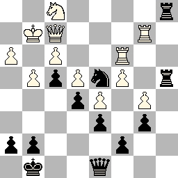 Ook Peter kwam niet verder dan remise op bord 8. Toch zat er nog een mooie winstkans in voor Peter. De toelichting van Peter: "In deze stelling speelde ik in tijdnood 36... De7 37.Pd2 g5 38.Pb3 Pxb3 en na afruil van het sterke paard was het remise. Winnend is 36... Da8. De dame moet er gelijk bij komen om te profiteren van het sterke paard en om te verhinderen dat het wordt geruild. De computer geeft hier +2 voor zwart. Bijvoorbeeld 37.h4 T4a2 38.Td2 Da4 39.Kh3 Txd2 40.Pxd2 Dd1 41.Td3 Dc2 42.Txd4 Td1. Wit wint tijdelijk een paard en de stelling stort in. Of 37.Td2 T4a3 38.Txa3 Dxa3 39.h4 Dc3 40.h5 Dxc4. Zwart wint twee pionnen." (3,5-2,5).