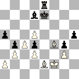 Ikzelf was lang bezig aan bord 5. Tot 23.30 uur. Een wat langere uitleg van de partij deze keer omdat er toch wel leuke verwikkelingen in zaten. In een Siciliaanse partij waar ik wit had ging het lang gelijk op. De vlam sloeg in de pan toe we beiden in het midden/eindspel met de f-pionnen oprukten. Een heel wankel evenwicht ontstond op het bord. Mijn tegenstander Lion de Kok rukte op met zijn g-pion en bedreigde daarmee mijn toren. Na lang wikken en wegen besloot ik deze toren te offeren tegen een loper. Deze laatste bestreek een ontsnappingsveld voor mijn koning (er was een matdreiging) en ik denk dat het offer juist was, want er ontspon zich nog een mooi gevecht. Ik had het loperpaar en mijn tegenstander toren en loper. Mijn lopers en mijn intacte pionnenstructuur hielden de toren, loper en koning op afstand. Mijn tegenstander had nog iets van 5 minuten op de klok en ik 20. Bovendien wist ik een pion te winnen. Ik schatte in dat remise er in zat. Ik geeft hierbij een diagram na de 46e zet van zwart.