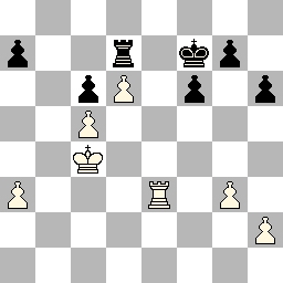 De partij van Marinus (die wit had) tegen Michel van Deursen was er ook een van gelijk opgaande kansen. Hierbij de stand na de 43 zet van wit. Beide partijen 5 pionnen, een toren en koning. De beste stuurlui staan aan wal. Toen ik deze stand zag, als toeschouwer aan de zijlijn, was ik ervan overtuigd dat wit zeker zou gaan winnen. Wits pionnen zijn ver opgerukt, er is een potentiele vrijpion op de a-lijn en de witte toren houdt de vijandelijke koning op afstand. Zwart kan alleen afwachten. Toch blijkt dat de zwarte pionnen op de f- en g-lijn veel tegendruk kunnen geven. Een spannende wedloop begon. Er volgde: 43... Kf8 44.Kb4 Kf7 45.Ka5 Kf8 46.Ka6 Kf7 47.Tb3 (een moeilijke keuze, je opent nu een deur voor zwart, maar misschien toch goed deze zet?) 47... Ke8 48.Tb7 Txb7 49.Kxb7 Kd7 50.a4 g5 51.a5 f5. 52.a6 f4 53.gxf4 gxf4 54.Kxa7 f3 55.Kb7 f2  56.a7 f1D 57.a8D Db1+ 58.Ka7 Da1. Remise. Misschien dat de winst er toch ingezeten heeft voor Marinus maar bij een snelle eerste analyse ter plekke was dat nog niet gevonden.