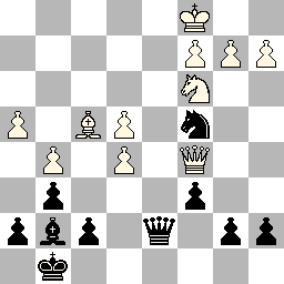 Het is een beetje vreemd om van de winnaar een partijfragment te tonen van zijn enige remise. Maar aangezien die remise tegen mij was en ik me de partij nog kon herinneren, wil ik deze toch graag even laten zien (ook vanwege de mooie combinatie). In de tweede ronde speelde ik tegen Hans Klip. In de eerste partij met Wit verloor ik al snel een stuk. Ik gaf daarop die partij meteen op, zodat ik me kon concentreren op de tweede partij. In de Fantasie-variant van de Caro-Kann had ik een pion op e5 geofferd in de verwachting deze meteen terug te winnen, maar Hans bleef deze pion maar verdedigen. In de diagramstelling heeft Wit zojuist Dc5 gespeeld om de witte pion op e5 nog een keer te dekken. Bovendien valt hij daarbij het zwarte paard op c4 aan. Na afloop van de partij gaf Hans aan dat hij beter op a7 had kunnen slaan. 1... Lxe5! Hier moest Hans goed over nadenken. Wit kan namelijk niet terugslaan op e5: 2.Lxe5 Dd2+ 3.Kb1 De1+ 4.Pd1 Dxd1#. Hans sloeg daarom maar het paard, volgens Fritz het beste. 2.Dxc4 Lxf4+ 3.Kb1 Dd2 4.Df1 De3 Hier bood ik remise aan, waar Hans even over moest nadenken en tenslotte aannam. Niet alleen heb ik eindelijk mijn pion teruggewonnen, maar ik sta beter (volgens Fritz is het -1.09). De witte pionnen op e4 en h4 zijn zwak en bovendien is de zwarte loper sterker dan het witte paard. Sommige toeschouwers zeiden dat ik door had moeten spelen, maar ik had nog maar 2½ minuut op de klok en Hans twee keer zoveel. En een remise tegen Hans voelt toch als een soort overwinning.