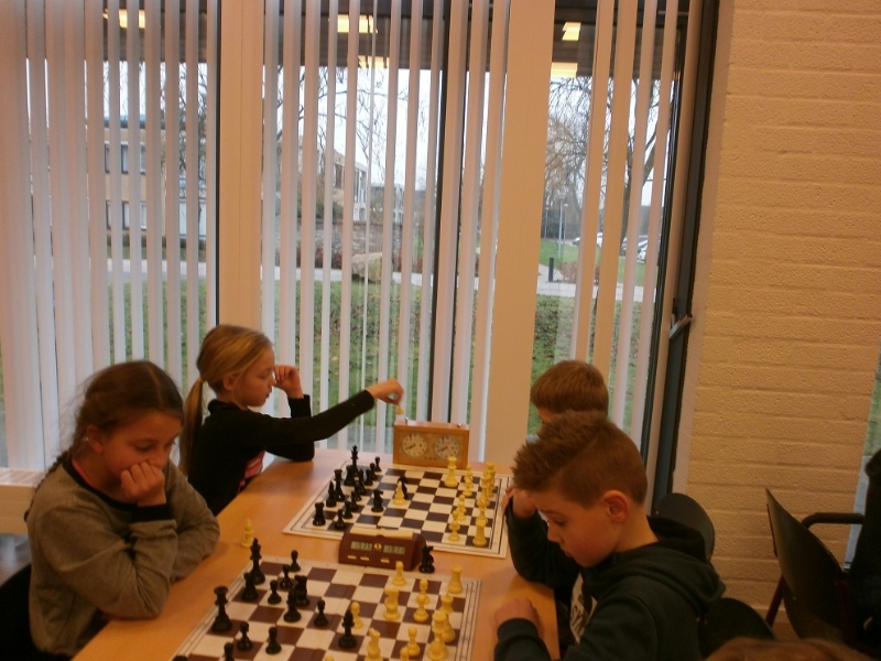 In ronde 4 kwam Maarten met D,T en L tegen 2 T L en P goed te staan,maar toen ik na het drinken van mijn kopje koffie terugkeerde in de arena, waren alle stukken van hem verdwenen terwijl de tegenstander nog een toren en veel pionnen had. Het verlies was niet meer te vermijden. Dit bracht hem op 2/3. Bij Josephine ging het van kwaad naar erger: ze verloor 2 kwaliteiten, kwam 2 torens achteren verloor daarna ook nog de dame. Dat was teveel van het slechte en kon ze de eerste nul incasseren: 2,5/4. In een aanvankelijk gelijkopgaande partij won Willemijn uiteindelijk via een dubbele aanval een toren en belandde in een stelling met D, T en L tegen een D. Daar wist ze wel raad mee: de 4e scalp werd veroverd: 4/4. Lise won in een eindspel waarbij haar tegenstander in een trucje trapte: 3/4.