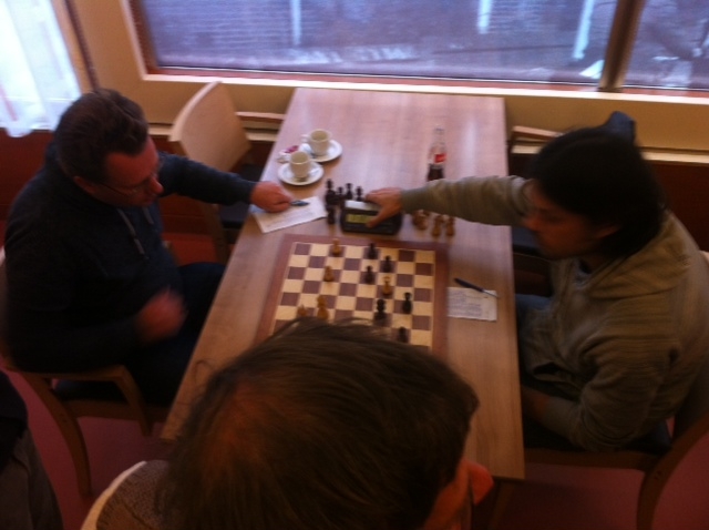 De tegenstander van Paul (op 4) stond in het eindspel zo veel materiaal achter (zie foto) dat hij van zijn enorme tijdsvoorsprong geen wapen meer kon maken. Weer een punt.
