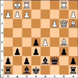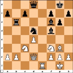 Misschien was het praktisch gezien het beste om nu (zie diagram links) maar zo snel mogelijk te rokeren (en een kruis te slaan), maar hier blunderde Zwart met 14. … e6??, en na 15. Lb5+ Ld7 ontstond de volgende, voor Zwart hopeloze stelling (zie diagram hieronder).