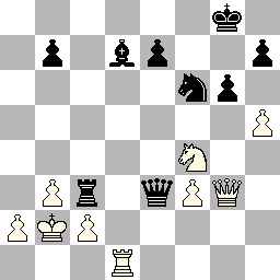 Maar, dat is het boeiende en fascinerende van het schaakspel, materiaalvoordeel is niet altijd beslissend. Markus had een stuk meer (paard) tegen een pion, maar zijn paard deed niet echt mee; het zat vast gepind tussen pionnen. Bovendien ging voor het eerst de factor tijd serieus meespelen in deze partij. Beiden hadden we nog ongeveer 1 minuut op de klok. Ik geef hierbij de stelling bij ongeveer de 40e zet (er werd niet genoteerd, ik heb de partij in mijn geheugen teruggehaald):