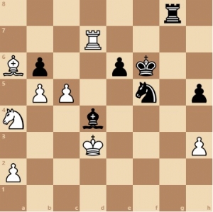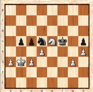 Wit heeft zijn paard mooi teruggespeeld naar e5 en houdt de zwarte koning in bedwang, maar hier kwam 47. … c5!, een lastige zet voor Wit. Natuurlijk naar 48. c4 gekeken, maar wint Zwart dan niet gewoon een pion met 48. … cxd? Jawel, maar dan de tussenzet (altijd moeilijk, zeker na 5 uur spelen) 49. Pf3! en Wit staat nog steeds gewonnen. Ik speelde echter 48. Kc2? waarna Zwart de d-pion won en er uiteindelijk twee kale koningen overbleven.