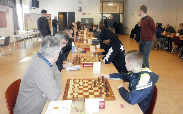 Hoe zat het elders? Lukas (bord 5) speelde een soort Konings-Indisch (Catalaans misschien, wie zal het zeggen? Ik in elk geval niet) en kreeg ruimtelijk overwicht. Na een uurtje was er min of meer evenwicht in de stelling te zien. Maar het oud-SMB-lid Niels Radder zette een koningsaanval in gang met Dh3 en een paardmanoeuvre en na verdubbeling van zijn torens werd de druk voor Lukas steeds zwaarder. Charles, aan bord 6, kreeg intussen een goede stelling, een mooie ontwikkeling en kon ook nog een pion buitmaken. Al bleef de stelling positioneel in evenwicht.