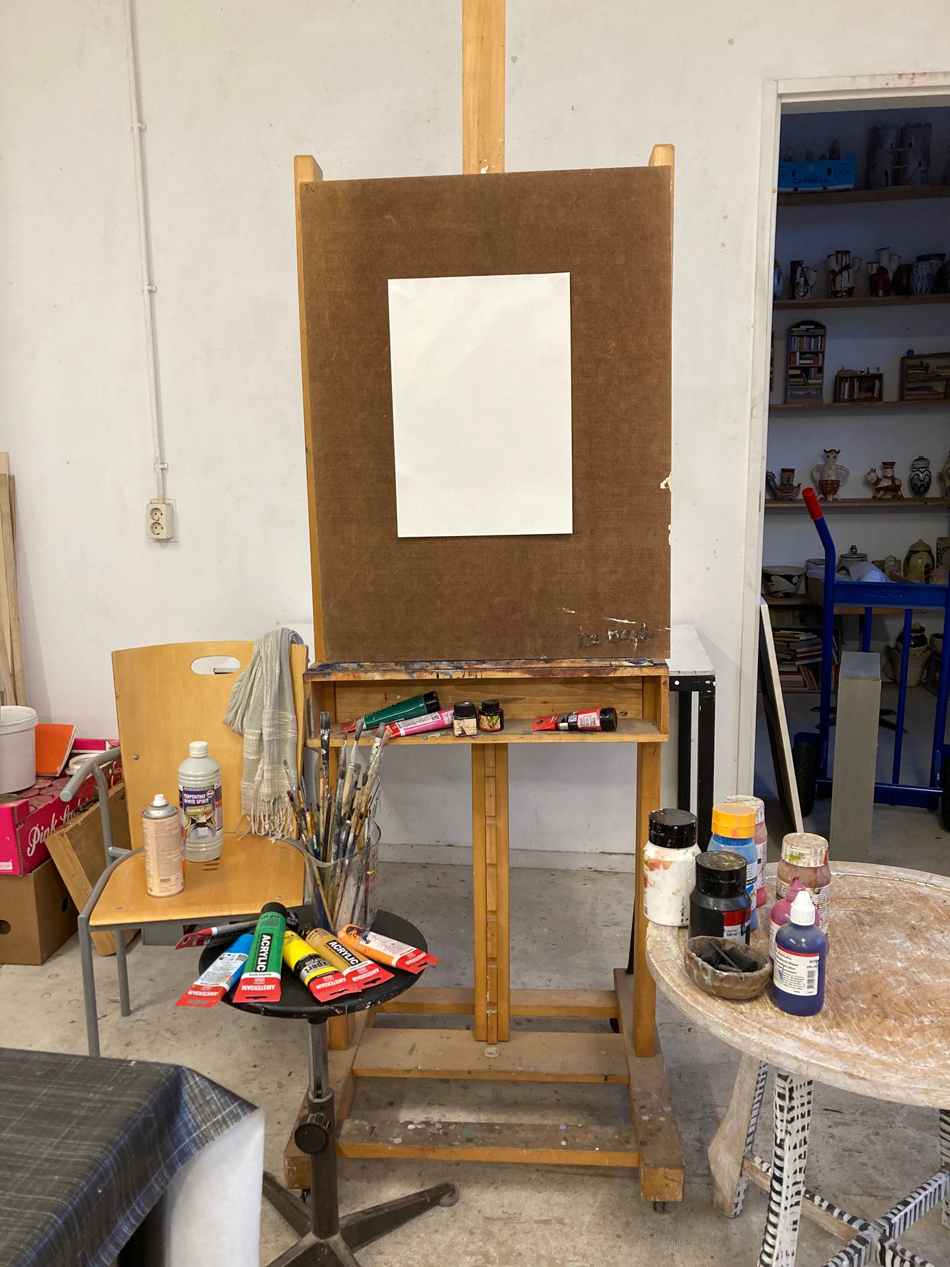 We zijn de hele middag op het bord bezig geweest. Kwasten en verf lagen te verdrogen op tafel, de klaargelegde tekenvellen zielig ongebruikt. Op een gegeven moment zijn we gestopt omdat Christine het te koud kreeg. Logisch ook, ongekleed 2 uur schaken in een onverwarmd atelier is iets teveel van het goede.