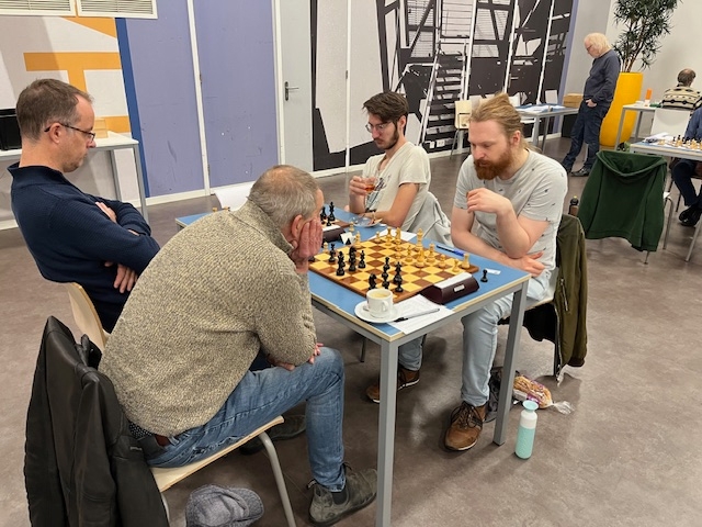 Die had ik dus verkeerd ingeschat. De 3-2 voorsprong die ik verwachtte toen ik Luc op zag staan was dus een achterstand, waardoor het een stuk spannender werd. Een stukje later was Thomas klaar, die zijn tegenstander diep in het eindspel verraste met een noodzakelijke paardpromotie(!), die daar blijkbaar zo van schrok dat de dame direct werd geblunderd. De stand weer gelijk, met alleen Jacques en Peter die nog aan het schaken waren. Jacques was al de hele partij een (voor mijn gevoel) iets mindere stelling aan het verdedigen, maar kwam nooit echt in de problemen en haalde diep na de tijdcontrole een verdienstelijk halfje binnen.