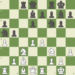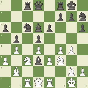 Volgens mij kwam pas daarna de eerste "echte partij" los en wel de partij van Eric aan het eerste bord. "In eerste instantie zou ik invallen aan bord 4 voor Jeroen, maar toen ook Jelle niet kon, werd ik gepromoveerd naar het eerste bord. Daar speelde ik met wit tegen Alexander Bouwman. Het werd een korte partij. In de diagramstelling heb ik zojuist 14.a4 gespeeld en hier dacht Alexander meer dan 20 minuten na, alvorens te blunderen met 14... Db6?? Ik had hier direct kunnen winnen met 15.e5!, maar ik zag het niet. Na 15.axb5 dacht Alexander opnieuw lang na en met 15... axb5? kreeg ik een tweede kans. Deze keer zag ik het wel en na 16.e5! dxe5 17.dxe5 gaf Zwart op."
