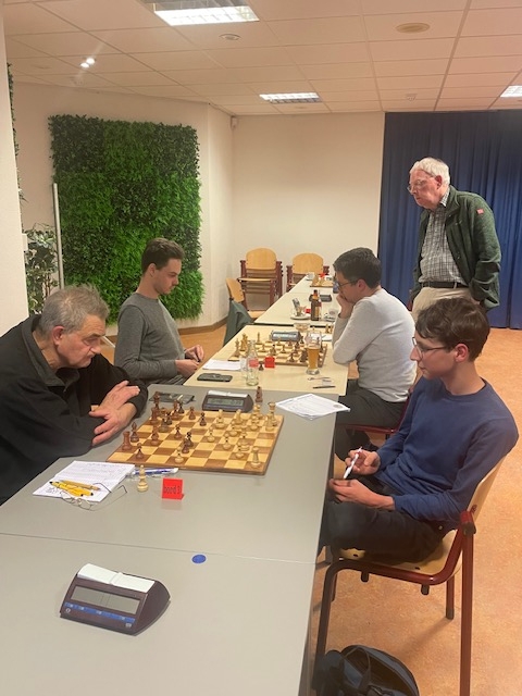 Een paar minuten later kwam Rolf, samen met zijn tegenstander Wilbert Reynen, ook de barruimte binnen met een remise mededeling. In een scherpe opening, de 4 pionnen variant van Aljechin (p.s. later maar eens opzoeken hoe die eruit ziet) kwam Rolf vanwege zijn betere openingskennis goed in zijn spel. Hij kwam een sterke pluspion voor maar blunderde die op een gegeven moment zomaar weg, zonder compensatie. Rolf vertelde dat hij toen zo gedesillusioneerd was dat hij verder spelen op winst niet meer zag zitten. Vanuit dat psychologisch gevoel werd een gelijkspel de logische uitslag, ook al vanwege het feit dat zijn tegenstander een hogere rating had en in een vervolg-eindspel is dat vaak beslissend.