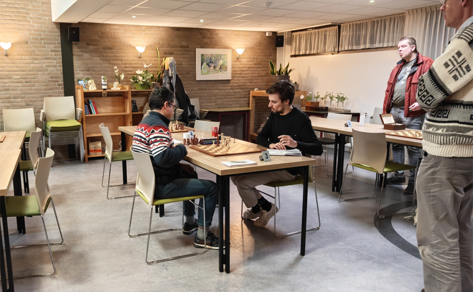 De eerste die een welkom halfje op het scoreformulier wist te krijgen, was Jelle. Niet helemaal fit was hij in de auto gestapt en dus zou hij aan bord 1 een extra zware avond beleven. Tenminste, als Jelle daar Rijk-Pieter zou treffen. Gelukkig voor hem zat die voor de gelegenheid aan het tweede bord tegenover Rolf. Jelle kon zijn (eveneens sterke) tegenstander Len Brands ondanks zijn conditie gelukkig goed tegenstand bieden en kwam remise overeen.