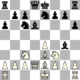 |  |  |  | Stelling na 9.Dd2 |  |  |  |  De Jong - Van HanswijkLucas (bord 4) begon zijn patij een stuk beter, er waren wel een beetje problemen met communicatie, maar toen een bord met coordinaten werd gepakt was ook dit probleem opgelost. Zwart speelde hier 9... Pe5? 10.Pxe5 Lxe5 11.Lxg4 en had toen een stuk minder. Ook na 10.Lxe2 Pxf7 komt zwart er slecht vanaf. Lucas kon zijn voorsprong verder uitbreiden en won gemakkelijk. 1-0