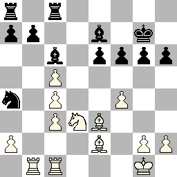 Zelf had ik ook geen gemakkelijke partij tegen Jan Van Kessel. Ik was vroeg uit mijn openingstheorie, maar ik kwam toch beter uit de opening. Mijn stukken stonden beter ontwikkeld en ik kon voorkomen dat hij rokeerde, maar toen ik liet een dameruil toe. Toen deed ik iets minder goede zetten en mijn voordeel was weg. Ik kwam in deze remiseachtige stelling terecht:
