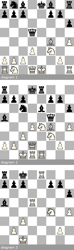 In de 5e ronde van de OSBO competitie speelden we met SMB 2 tegen Mook 1. Om niet in accuut degradatiegevaar te komen moest deze wedstrijd gewonnen worden. Ik verwachtte op bord 1 Jan Spoorenberg te treffen, met wie ik nog een appeltje te schillen had. In onze vorige ontmoeting had ik verloren nadat ik in tijdnood een mat in 7 gemist had. 1.e4 e5 2.f4 Het koningsgambiet maar eens van stal gehaald, er moet gewonnen worden toch? 2... exf4 3.Pf3 d6 4.Lc4 h6 In de auto naar Mook toe vertelde Peter Schut dat Jan deze variant speelde. De tijd om voor te bereiden was er niet meer, dus vanaf hier was ik out off the book. 5.h4 Pf6 6.d3 d5 7.Lxd5 Pxd5 8.exd5 Dxd5 9.Lxf4 (zie diagram 1) Mijn tegenstander vertelde na afloop dat de door mij gekozen opstelling het meest vervelend is voor zwart. 9... Lc5N Dit is een nieuwtje, bekend is nog 9... Lg4 10.Pc3 De6 11.Kf2 Lc5 12.Kg3 Ld6 13.Te1 Lxf4 14.Kxf4 g5 15.hxg5 hxg5 16.Kg3 0-0 17.Txe6 Lxe6 18.Pxg5 Lf5 19.Df3 Lc8 20.Dh5 Lf5 21.Dh6 Pd7 22.Pce4 f6 23.Tf1 1-0 Jung,H (2255) - Qita, W London, Canada 1993 10.De2 Kd8 Twijfelachtig, beter is 10... De6 11.Lxc7 Pa6 12.Dxe6 Lxe6 13.Le5 met een klein voordeel voor wit. 11.Pc3 Df5 12.Dd2 Te8 13.Pe4 Pc6 14.0-0-0 Lb6 15.The1 Le6 16.d4 La5 17.c3 (zie diagram 2) 17... Lxa2?? Beter is 17... Ld5 18.Pg3 Dg4 19.Pe5 Dxh4 20.Pf5 Df6 21.g4 met groot voordeel voor wit. 18.d5+- Pe7 18...Pb4 19.Pe5 Pd3 20.Pxd3 Txe4+- 21.Df2 Txf4 22.Dc5 en zwart gaat tenonder aan de vele dreigingen, bv 22... Dxd5 23.De7 Kc8 24.De8 Dd8 25.Dxd8 Kxd8 26.Pxf4 Ld5 27.Txd5 Kc8 28.Te8# (zie diagram 3) 19.d6 Dit vergooit een groot deel van het voordeel. Veel beter was 19.Pd4 Dg6 20.b4 Pf5 21.Pc6 bxc6 22.Dxa2 Lb6 23.h5 Dxh5 24.dxc6 19... Pd5 20.dxc7 Lxc7= Hier heb ik met nauwkeurig spel de ten dode opgeschreven zwartveldige loper van mijn tegenstander weer tot leven gewekt :-) 21.Lxc7 Kxc7 22.Dd4 Tad8 23.Dc5 23.Dxa7!? Txe4 24.Da5 Kc8 25.Da8 Kc7 26.Da5 b6 27.Da7 Kc8 28.Da8 Kc7 29.Da7 Kc8 30.Da8 Kc7 31.Da7+= 23...Kb8 Op dit moment hadden we beiden nog minder dan 5 minuten over. 24.Pfd2? Beter is 24.Ped2 b6 25.Pd4 bxc5 26.Pxf5 24...Te5?? Zwart kan hier winnend voordeel krijgen met 24... Dd7 25.Df2 Dc7 26.Pc5 Txe1 27.Txe1 25.Pd6?? Met allebei nog minder als 2 minuten op de klok dacht ik dat dit op slag won. Er zit echter een heel klein iets niet helemaal goed in mijn idee. 25... De6 Nu komt het toch nog goed voor wit. Winnend voor zwart is echter 25... Pf4 26.Pxf5 Txc5 27.Pxg7 Pd3 28.Kc2 Pxe1 29.Txe1 Tg8-+ 26.Txe5+- Dxe5 27.Pxf7 De8?? 28.Pxd8+- Dxd8 29.Pe4 Dg8 30.c4 En hier ging zwart door zijn vlag. Tijdens en na afloop dacht ik een goede pot gespeeld te hebben, maar uit de analyse blijkt dat beide spelers over en weer toch vele kansen hebben laten liggen. 1-0