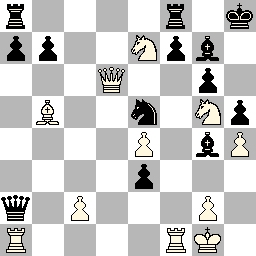 Zelf verloor ik met zwart vrij kansloos aan bord 2 tegen Michel Auwens. Soms heb je je avond niet. De partij leverde niettemin een leerzaam moment op. Wit heeft zojuist 8.Db3 gespeeld. Ik speelde hier, veel te passief, 8... Tb8?, een zet die me een pion zou kosten. Geboden was hier 8... Pa5, om de dame van de diagonaal g8/a2 af te krijgen. Na bijvoorbeeld 9.Da4 heeft zwart 9... c6 en het paard is gedekt. Die pion ging als volgt via een tamelijk eenvoudige combinatie verloren: 8... Tb8? 9.Lxe4 dxe4 10.Pg5 e6 11.Pxe4.