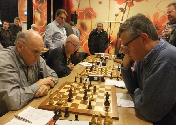 Ging het bij iedereen zo makkelijk als bij Pieter en Geurt? Zeker niet. Integendeel zelfs. Op alle andere borden werd hard gestreden, regelmatig binnensmonds gevloekt, gezucht en gesteund. Het liep niet lekker, eigenlijk slecht, bij de borden 3, 4 en 5. Peter op bord 6 stond nog redelijk gelijk, met een klein plusje, een pion voor. Wim Dentz sprak ik in even in de wandelgangen en hij geloofde niet dat we als team een overwinning konden binnenslepen. Hij dacht dat er maximaal een 3-3 uitslag aan het eind van de avond zou uitrollen.