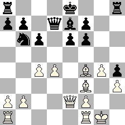 Ik was als laatste klaar. De openingsfase was interessant. Ik pakte wat ruimtevoordeel terwijl Zwart een actie op de koningsvleugel in gang zette. Door mijn pionnen voor de koning wat op te spelen wist ik dit gevaar echter te bezweren en toen ontstond nevenstaande stelling. Na een mislukte poging tot koningsaanval zit Zwart verlegen om een plan. Daarom besluit hij tot 18...Ld8? waarschijnlijk met het idee om te vervolgen met ...Lc7 om mijn sterke loper op f4 af te ruilen. Waar hij echter geen rekening mee hield, was dat hierdoor zijn e-pion in de penning kwam te staan. 19.d5! was daardoor ineens sterk en dat is precies wat ik speelde. Na 19...cxd5 20.cxd5 e5 (overigens nog de beste kans) had ik daarna een leuke tactische truc (21.Lxe5!), die me een pion opleverde (21... fxe5? 22.Dxe5+ wint de toren op h8). Het eindspel daarna speelde ik niet helemaal optimaal, maar Zwart bleef ook passief spelen waardoor ik op zet 35 met eeen nieuwe kleine combinatie nog meer materiaal won. Aangezien mijn vrije d-pion daarna niet meer te stoppen was, gaf Zwart op.