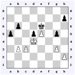 Aan teamleider Alexander Greefhorst dus de taak om op bord 1 te voorkomen dat onze competitiestart puntloos zou verlopen. De partij ging vrij gelijk op, maar toch wist zijn tegenstander Geert Smulders-Dinh met wit een dreigende koningsstelling op te bouwen. Een dameruil was de enige manier om de angel uit de aanval te halen, waarna al vrij snel alle andere stukken ook naast het bord belandden. Wat restte was een pioneindspel dat alle nog alle kanten op kon gaan (zie diagram links). Beide spelers zagen niet direct de juiste voortzetting hierin, maar remise accepteren betekende natuurlijk dat Tornado met de winst aan de haal zou gaan. Na 32. g4 h6 33. h3 was het Alexander die na 33. … b5 34. Kc5 a4 die aan het langste eind trok. De witte koning moest achter de doorbrekende pion aan, waarna zwart eerder aan de andere kant was om de witte pionnen te ruimen. 2-2, het eerste punt is binnen.